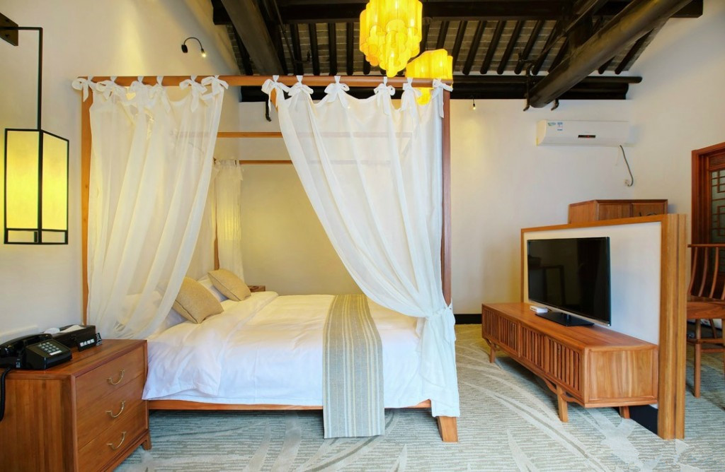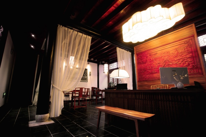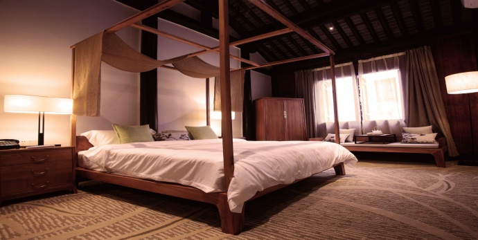 再走近客房,客栈共有玖间客房,其中最特色的是帷幔景致房,拥有上等实木全套明清式家私,帷幔架子床、香遮罗汉床、香案,四扇屏、圆木桶、木船式浴缸,别出心裁的为我们“剪裁”出一个空间,让人在此放松身心,只要栖居,不要纷扰。